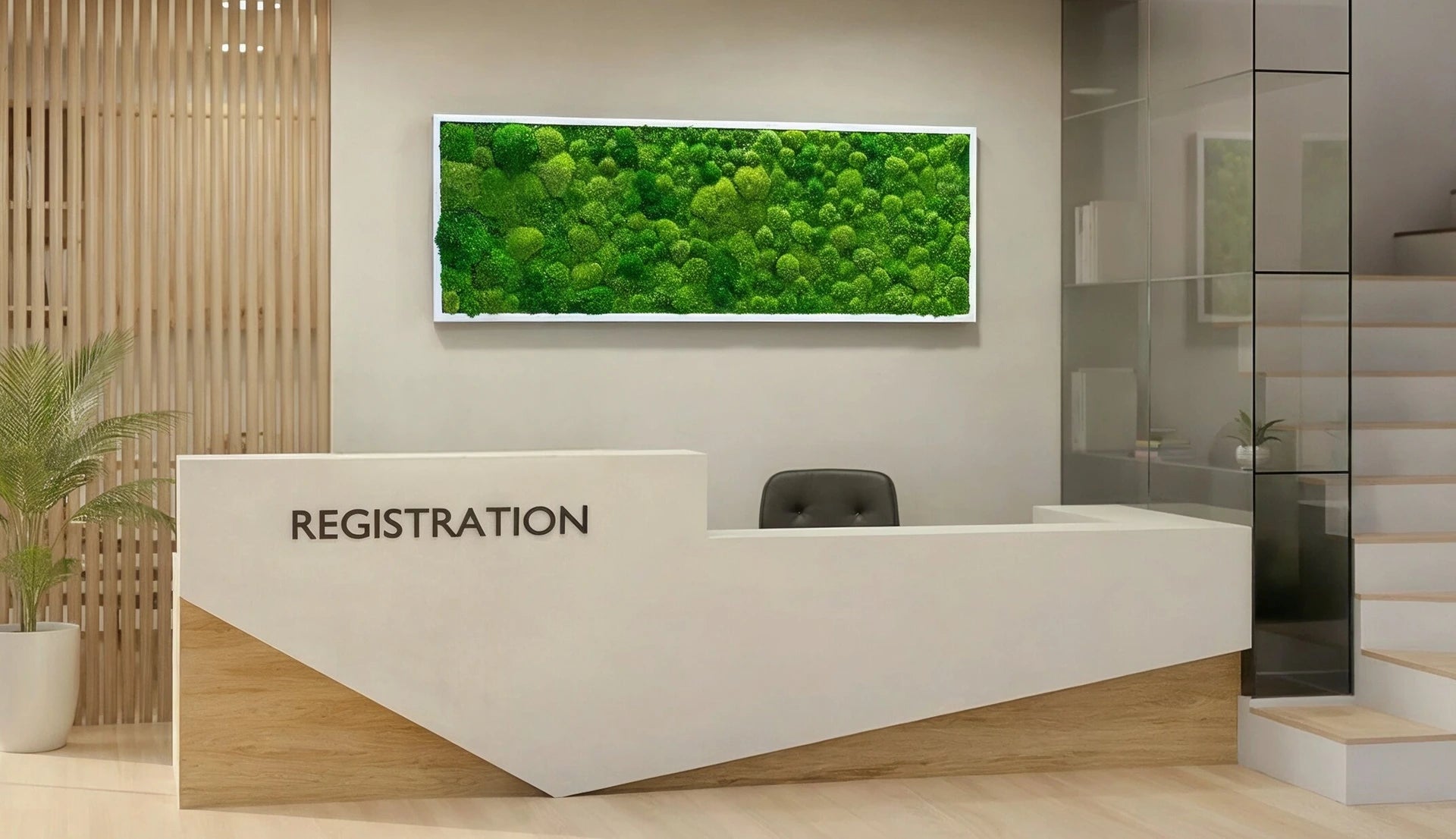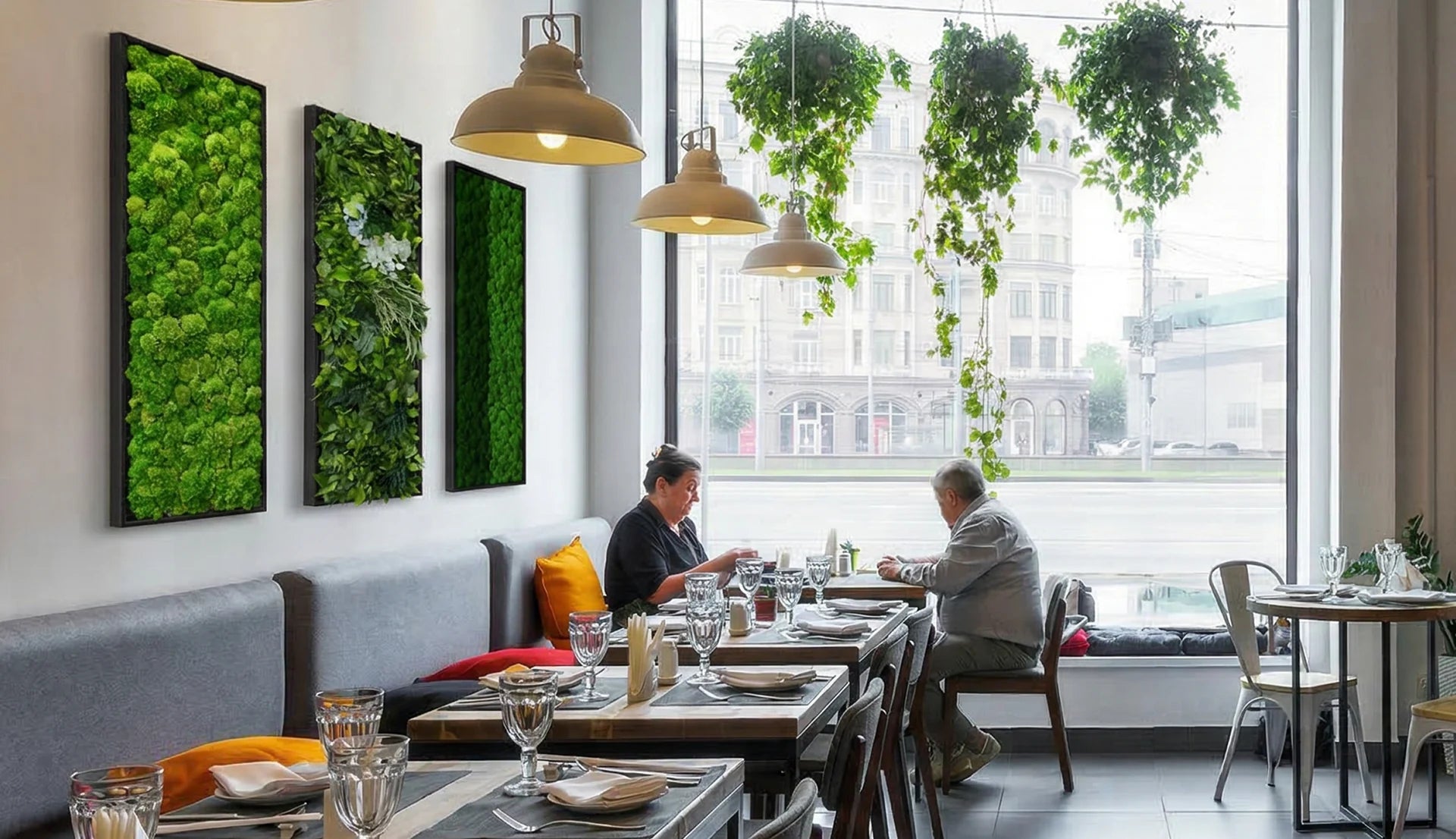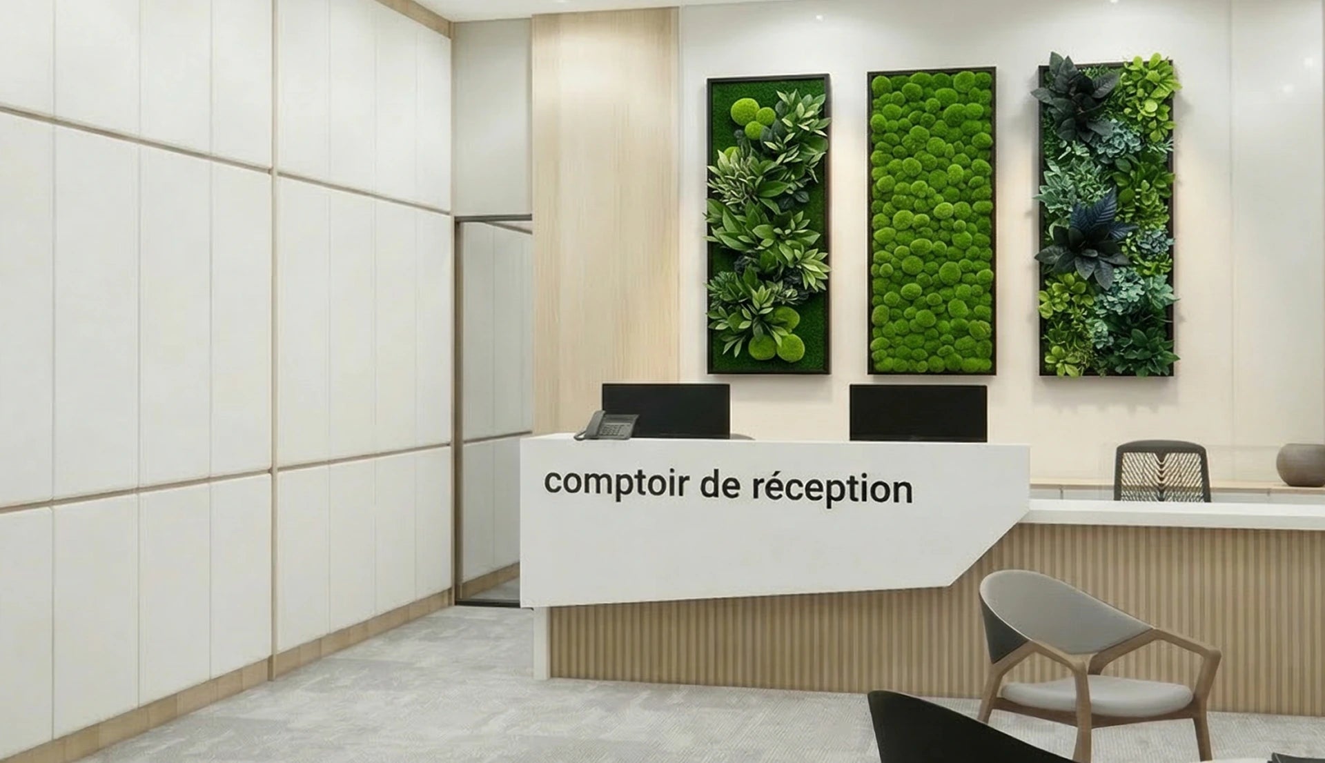 Le tableau végétal est un cadre décoratif ; le mur végétal intérieur habille tout ou partie d’un mur pour une signature visuelle et un confort acoustique renforcé.
